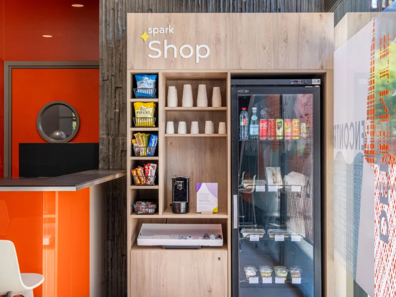 The Spark Shop is open 24/7 and offers a selection of food, beverages, and everyday essentials.