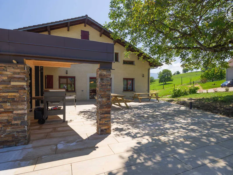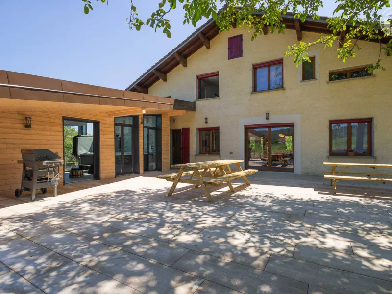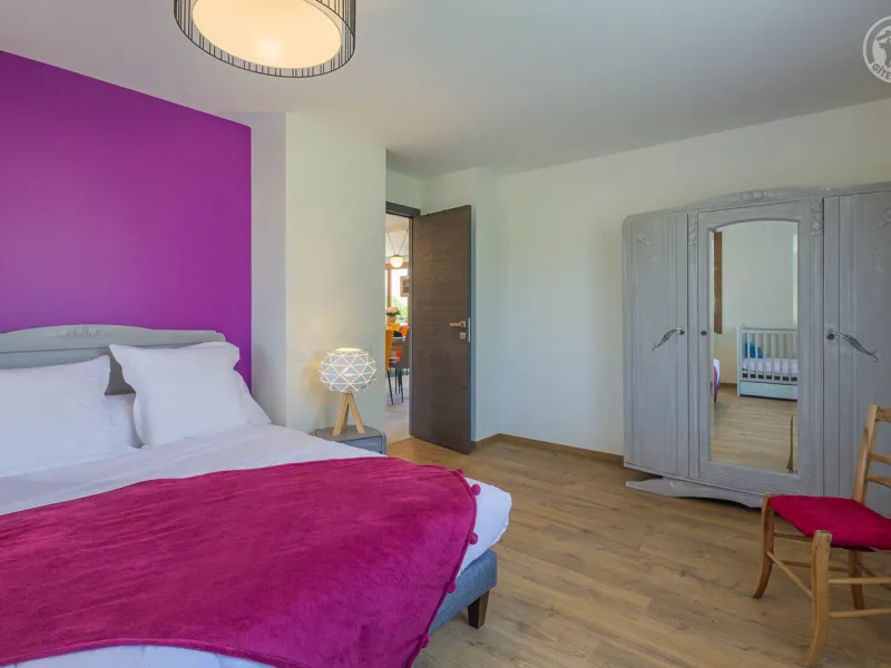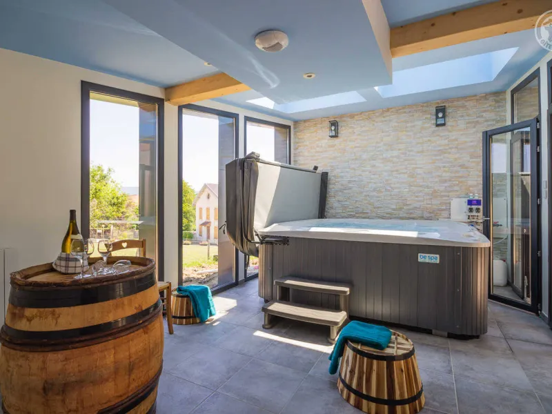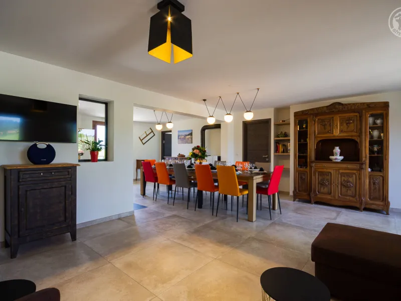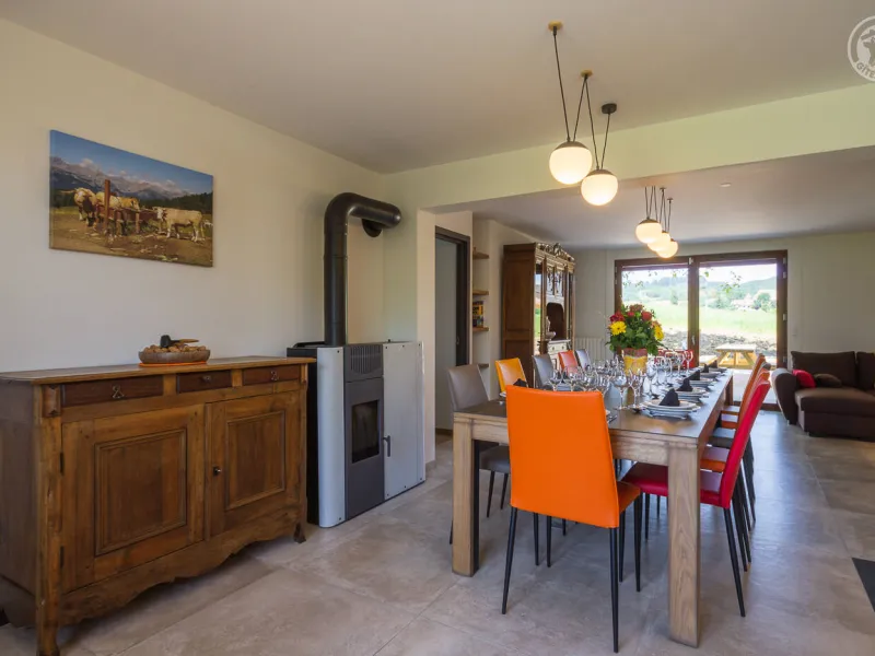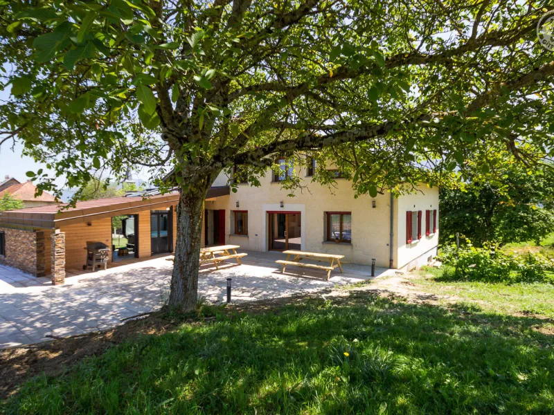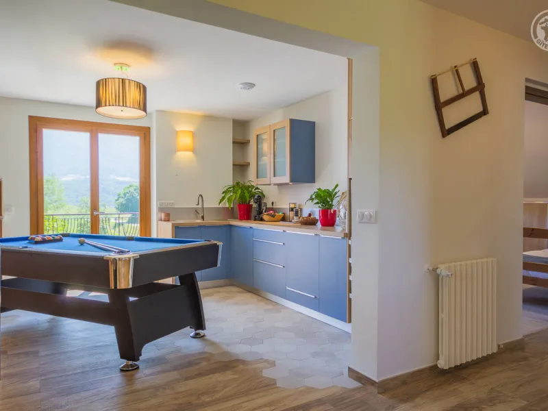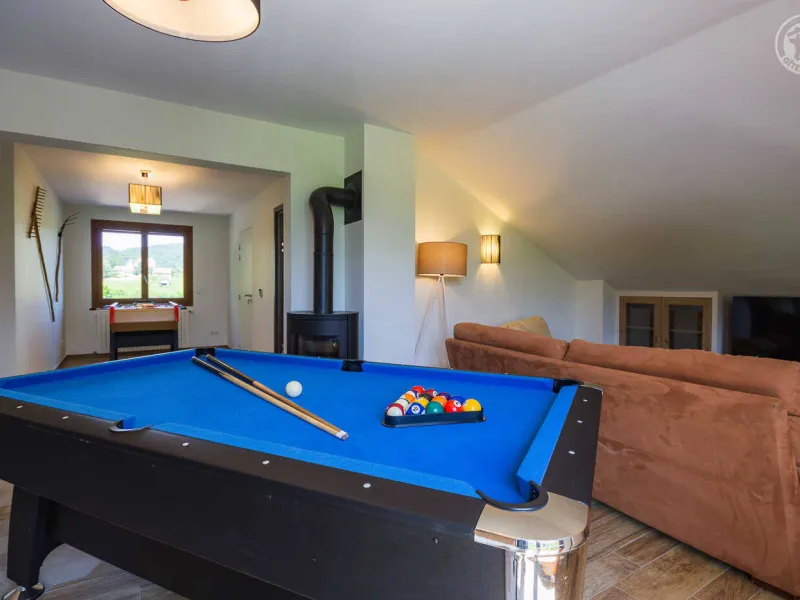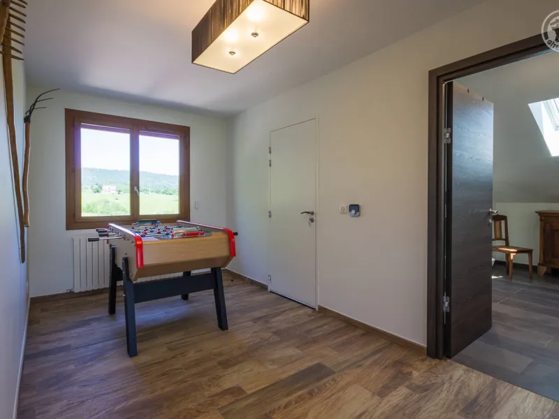In the heart of a country village, this renovated family house has preserved its charm while adopting contemporary comfort, with sobriety and elegance. The large terrace with plancha and spa invites you to moments of relaxation and conviviality. Like paintings, the bedroom windows offer a breathtaking view of the landscape. A second living room with a kitchenette is an ideal place for festive moments around billiards and table football. Everything is included, sheets and linens; the beds are made on arrival. Private parking for 4 cars.Detached house on 3 levels comprising on the ground floor: an entrance with laundry room and bicycle storage. 1st floor: kitchen-living room, pellet stove (automatic recharging), Bluetooth speaker, 3 bedrooms including 1 with private bathroom (1 double bed / 2 double beds 160 x 200 and a baby cot ), bathroom with WC (accessible for people with reduced mobility). 2nd floor: a living room with kitchenette, with billiards and table football, connected TV, wood stove, 3 bedrooms, 2 of which have a shared bathroom (2 double beds / 2 double bunk beds, 1 single bed), one bathroom (2 sinks) with WC, separate WC. 2 balconies. Land. Well-being area (7-seater sauna, shower and WC) outside the cottage. 16 m² bicycle storage room.