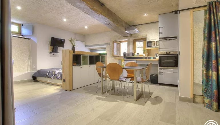 Do you know the Cysaril estate in the heart of a village of character? Welcome At the foot of the Grand Colombier, cottage for 4 people. This large 41 m² studio is accessible to people with disabilities. Many activities await you. Lakes, marshes, mountains: you will be seduced by preserved natural landscapes, where it is easy to escape between valleys, wooded ridges, and magnificent panoramas of the Alps and Mont Blanc. Are you more of a sporty type? Prepare yourselves. The Col du Grand Colombier, a legendary pass at an altitude of 1534 m, promises you beautiful climbs and spectacular panoramas. For gentler activities, marked trails will allow you to immerse yourself in the wild nature. Continue your discovery by immersing yourself in the surrounding lakes, such as Lake Barterand, lined with sculptures in the rock. Refresh yourself by the waterfalls of Cerveyrieu, Clairefontaine and Glandieu. Finally, enjoy a good meal and discover the gastronomy of the Brillat-Savarin region. Now discover your gîte, located below the owners' residence. Are you more of a SPA or sauna person? Prepare your moment of relaxation (4 hours warm-up for the SPA). What if you took advantage of this time to discover the LPO refuge? The owners will be happy to explain it to you. The entrance to the house opens onto the main room: equipped kitchen, dining area, a 160*200 bed with a view of the covered courtyard and two 90*200 retractable beds. Shower room with accessible WC. Laundry area. A secure covered courtyard, facing south, offers 21 m² of relaxation and storage of various equipment (bicycles, backpacks, hiking shoes). Extend your moments with family or friends on the private 42 m² outdoor terrace. Travel light: beds are made on arrival, bathroom linen, household linen, utilities, sauna and spa included. Cleaning €40 optional. Wood heating, indoor parking.