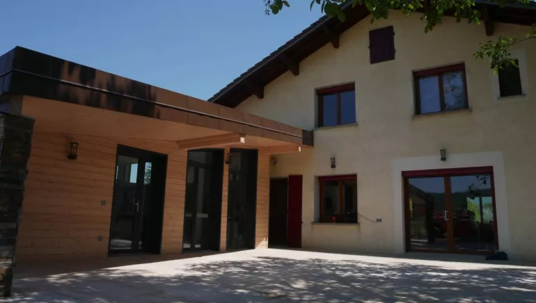 Une annexe extérieure au gite se situe sur la partie haute du terrain à l'ombre d'un noyer quinquagénaire ; elle est entourée d'une surface en gazon d'environ 1500m². L'espace extérieur non clôturé est ouvert sur les champs et le verger. Cette annexe abrite un jacuzzi, un four à pizza et une cuisine d'été. Elle est résolument moderne avec un toit plat et des baies vitrées. Sa terrasse ombragée de 110m² est couverte sur 15m² et équipée d'un barbecue, d'une table et de bains de soleil.