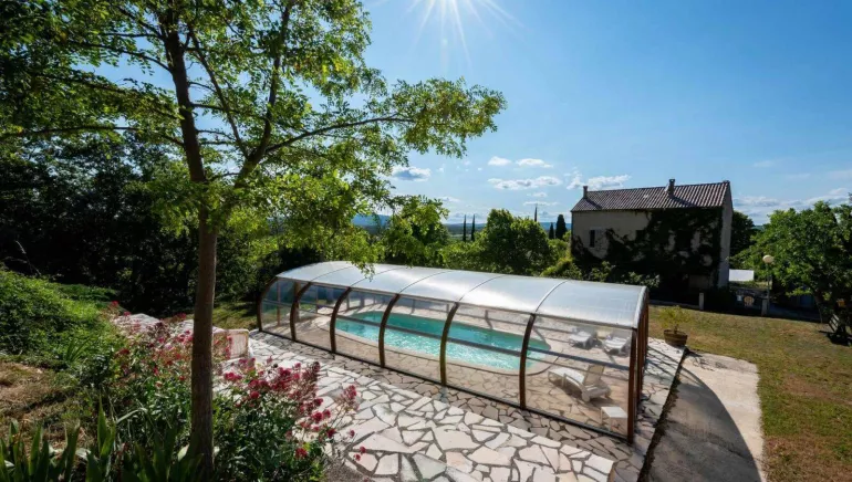 Living room (double sofa bed, wall-hung flat screen TV), fitted kitchen, mezzanine (double bed), 2 bedrooms (double bed) (2 single beds), bathroom, WC. Cot, high chair on request. Inset fireplace (free firewood), electric heating. Terrace, balcony, shared garden. Large shops 13km. Warm/cool air system. Covered swimming pool (4x9m) shared by 5 gîtes. Gîtes are 100m from waymarked hiking trail and about 3km from GR (long distance footpath). Towel hire: 3€/week/small towel, 5€/week/large towel.