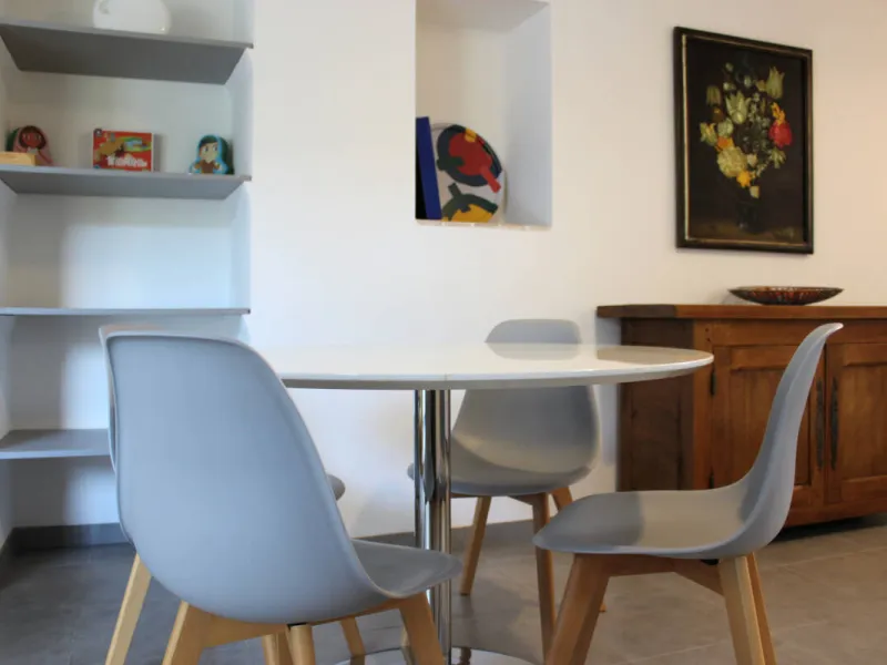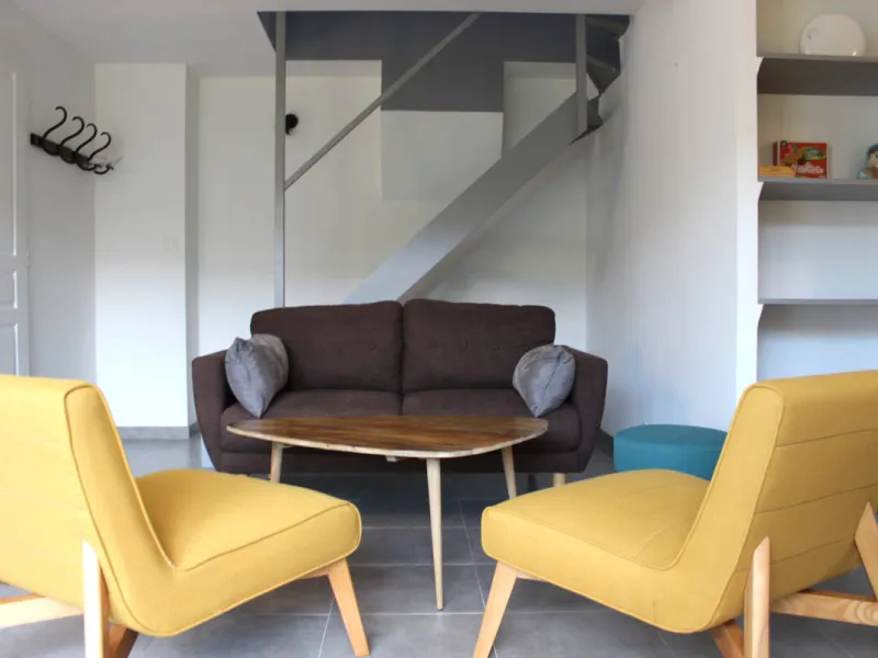 The first floor features a large 37m2 main room with a Scandinavian feel, comprising a cosy living room, a round dining table and a well-equipped open kitchen.