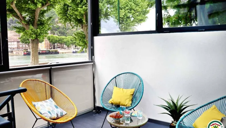 "Regard sur le Fleuve" is a waterside vacation home located in the heart of Tain l'Hermitage, in the historic and architectural center of the old town. Enjoy the exceptional view: the house's contemporary veranda faces the Rhône, the vineyards and the Château de Tournon, which you can reach via a suspension bridge reserved for pedestrians. From here, everything is accessible on foot or by bike. This is the ideal place to stay for a vacation. It's a central location for discovering the Drôme des Collines, the Drôme Provençale, and immersing yourself in exceptional places like Royans, Vercors or Diois, so close and yet so different at the same time. Direct access to the ViaRhôna. Electric bikes can be hired for our gîte guests (available in the garage).