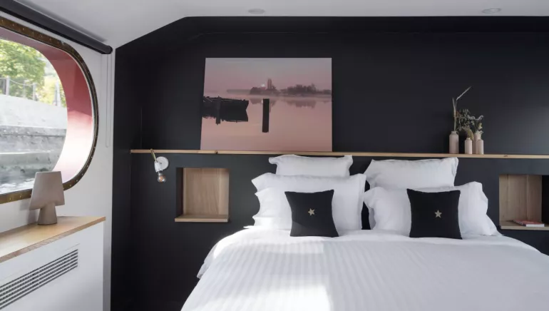 Discreetly, guests can enjoy a Nordic bath on the terrace deck, as well as a spa (+ sauna and massage table by reservation) in the basement. The winter garden and fully-equipped kitchen invite you to enjoy the moment in the company of other guests. Cyclists can leave their bikes in a secure container (QR code and surveillance camera) on the quay. This is a "connected" barge with QR codes for access to rooms and common areas, high-speed wifi connection + Air Play systems.