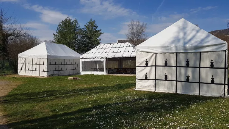 L’espace se compose de 2 tentes de 10 couchages chacune, une tente cuisine de 3m x 3m avec deux réfrigérateurs et 2 plaques gaz ainsi qu’une tente commune avec tables et bancs pour les repas.