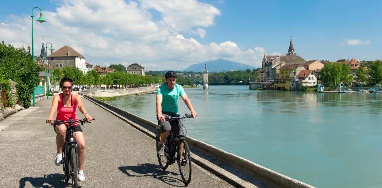 Given the steep slopes, busy roads (the D 908A and D 14), major junctions and lack of signposting between Clarafond and Châtel, this stage requires extreme care. Until the route is made safer, make sure you are well kitted-out and remain extremely vigilant. As you arrive at Seyssel you do join a cycle track.