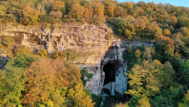 Arrive under this impressive porch and enter the bowels of the cliff to discover labyrinths, an underground lake, stalactites and stalagmites, an amphitheater of small pools... that's what the Grottes de La Balme have to offer.
