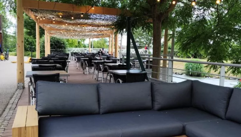 Terrasse couverte de 120 couverts avec salons extérieurs en bord de rivière dans un cadre idyllique au bruit du clapotis des vagues.