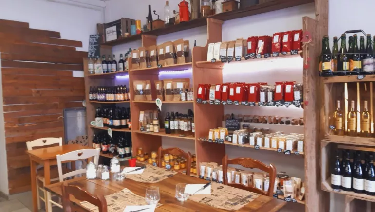 The restaurant is located at the very heart of the grocery shop, between the shelves of wines, local spices, jams, craft beers and spreads.... In season, you can also enjoy the outdoor terrace overlooking the cliffs of the Isle Crémieu.