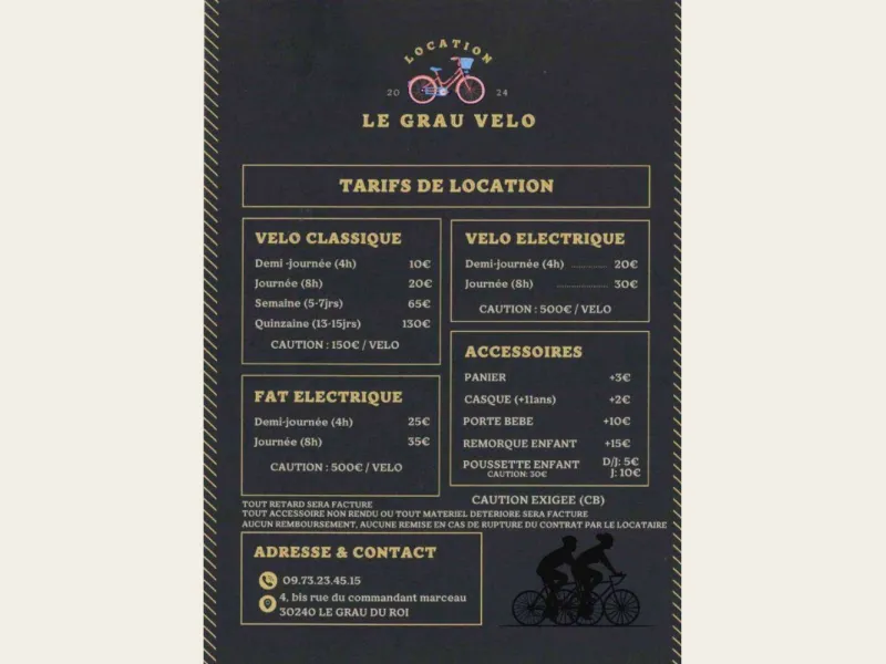 Le Grau vélo vous propose à la location des vélos simples ou électriques, à la demi-journée comme à la journée.Réparation : un atelier est prévu pour remettre en état ou entretenir les vélos.
